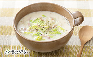 - ④に水と固形スープを加えて煮こみ、白菜の茎がすき通ってきたら牛乳と白菜の葉を加えて軽く火を通し、塩とこしょうで調味する。